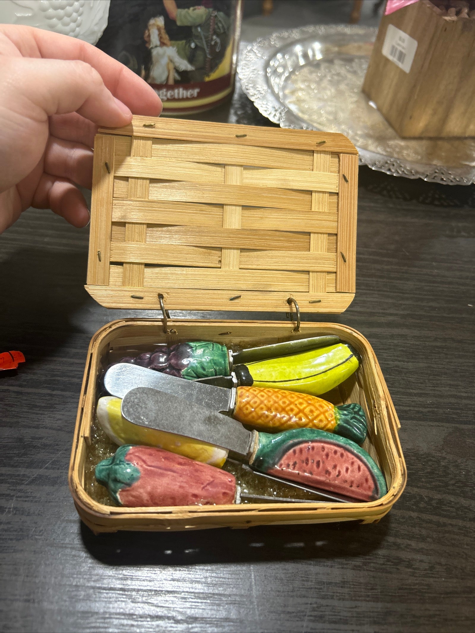 (417) VTG Six Stainless Steel Spreaders & Forks Ceramic Porcelain Fruit Handles Wicker